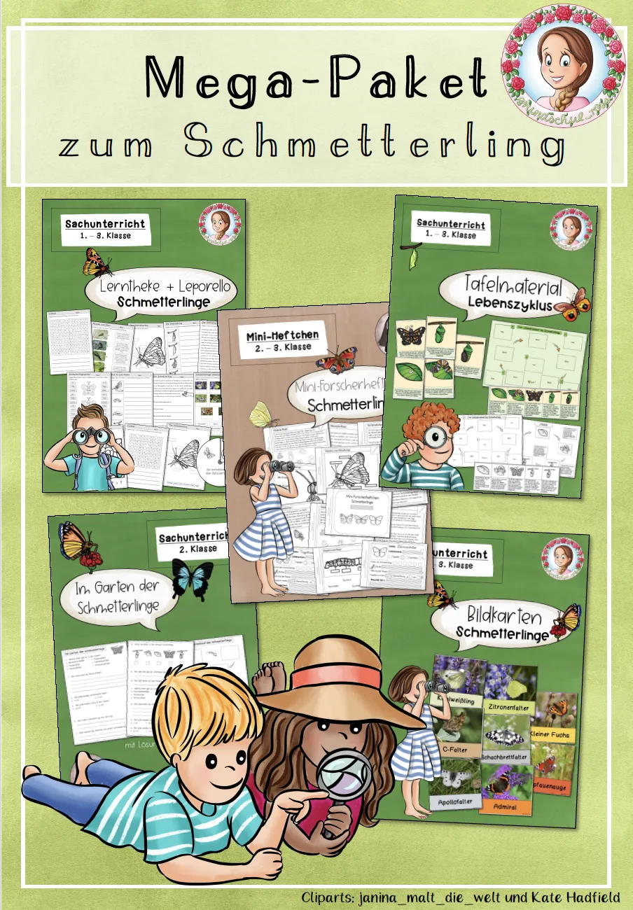 Mega-Paket zu den Schmetterlingen / Schmetterling für die Grundschule. Mega-Paket: Die faszinierende Welt der Schmetterlinge entdecken! Dieses umfangreiche Materialpaket ermöglicht es Kindern, Schmetterlinge in all ihren Entwicklungsstadien kennenzulernen. Von der Raupe bis zum Falter – mit Tafelmaterial, Bildkarten, einer Lerntheke und einem Mini-Heft wird das Thema anschaulich vermittelt. Perfekt für den Sachunterricht, Projekte oder fächerübergreifendes Lernen! Inhalte des Materials:…